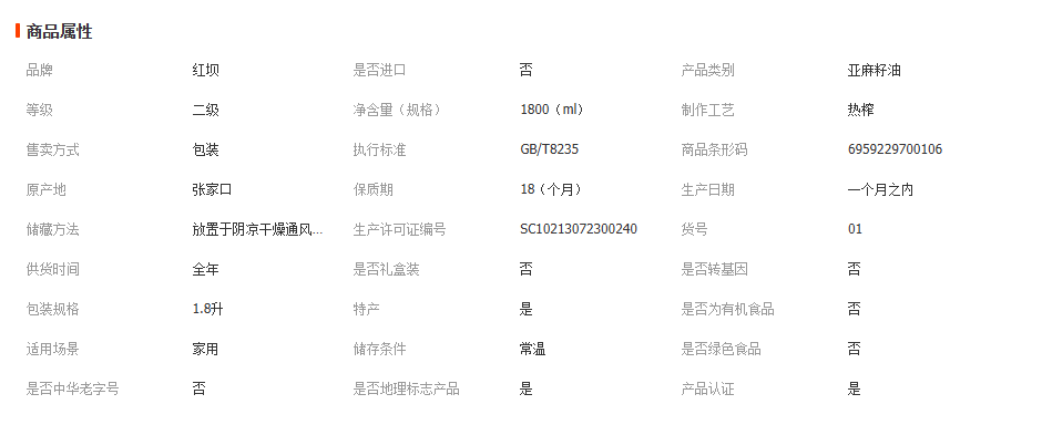胡麻油1.8L 康保县红坝牌家庭用炒菜月子婴幼儿产妇用亚麻籽油批