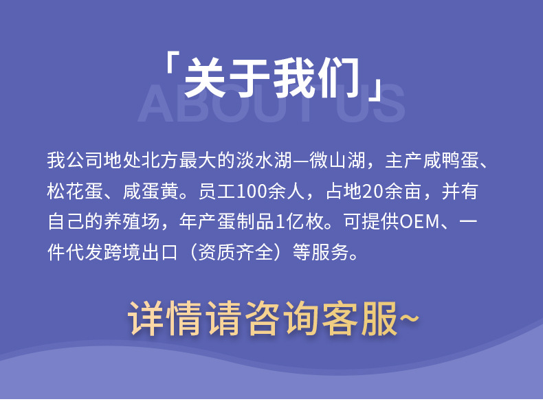 主营: 咸蛋类 皮蛋类 蛋黄类