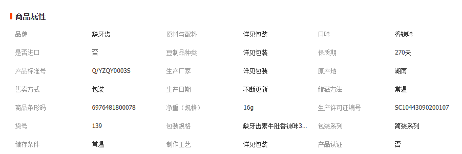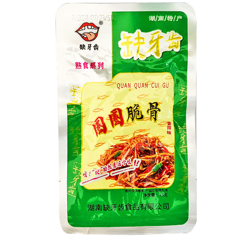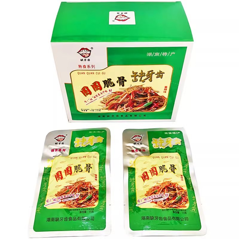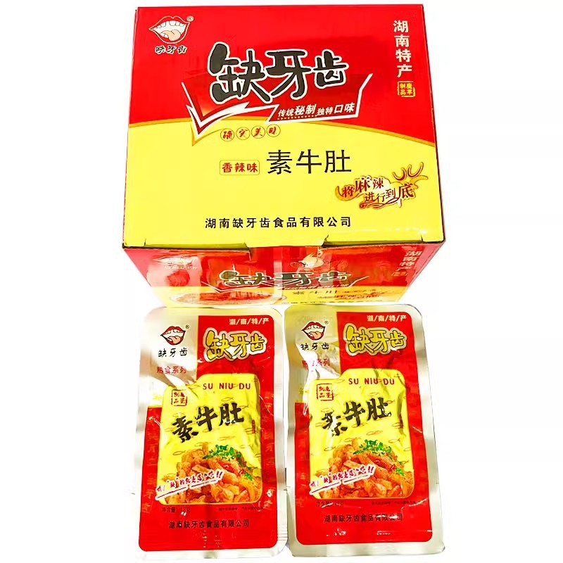 缺牙齿素牛肚系列:香辣素牛肚,香辣素耳尖 30包/盒 16g,1箱12盒。圈圈脆骨,脆骨素牛肚,脆骨鱼仔 30包/盒 15g,1箱20盒;建议按整箱数量购买;避免运输破损以及方便您核对点数。