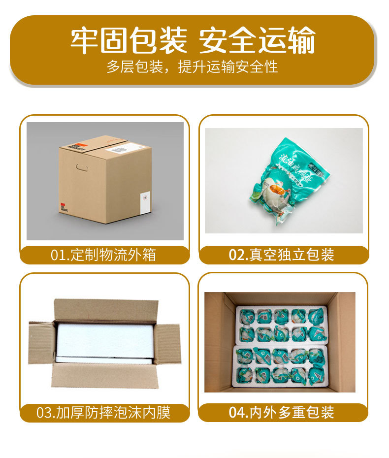 本品包装采用:真空袋+泡沫蛋托+特硬快递纸箱包装,破损率低,真空包装轻微破损不影响食用请亲谅解,磕碰出油请传图予以赔偿。