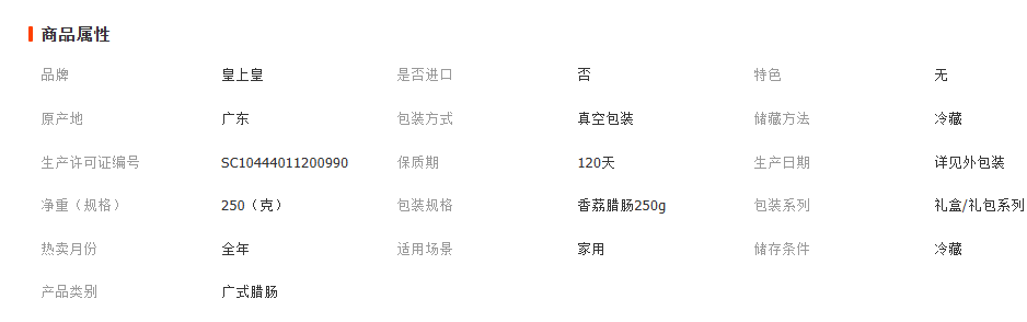 皇上皇香荔腊肠250g广式腊肠广味煲仔饭甜味香肠五分肥瘦广东特产
