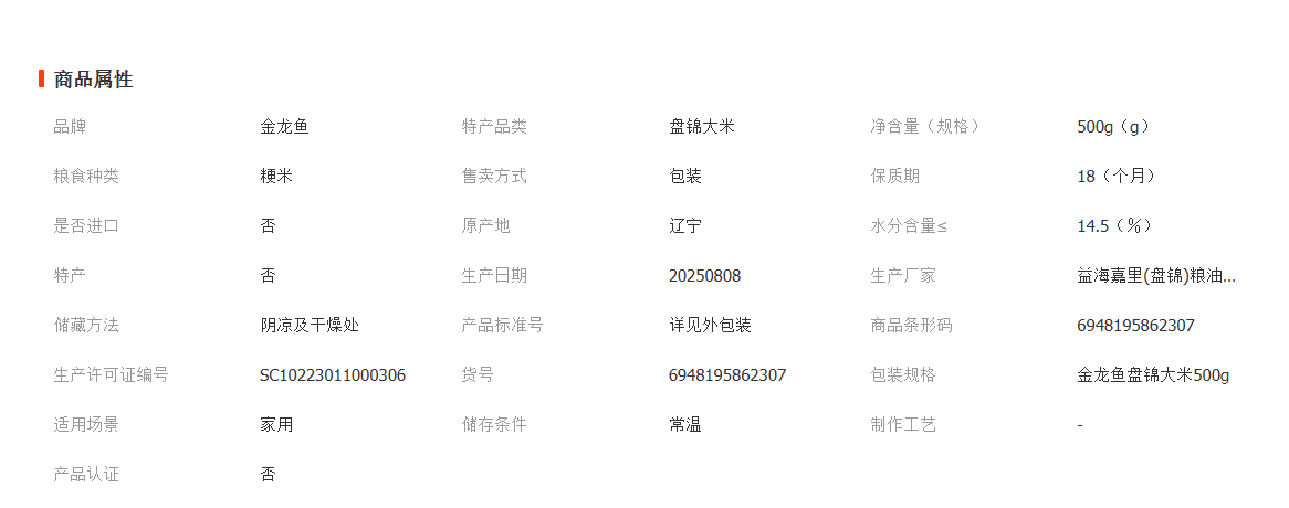 金龙鱼盘锦大米500g小袋礼品生态东北珍珠大米