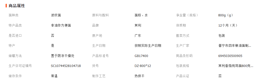 其利香菇炖鸡面800克*12包非油炸方便面热烘干面待煮面条工厂直批