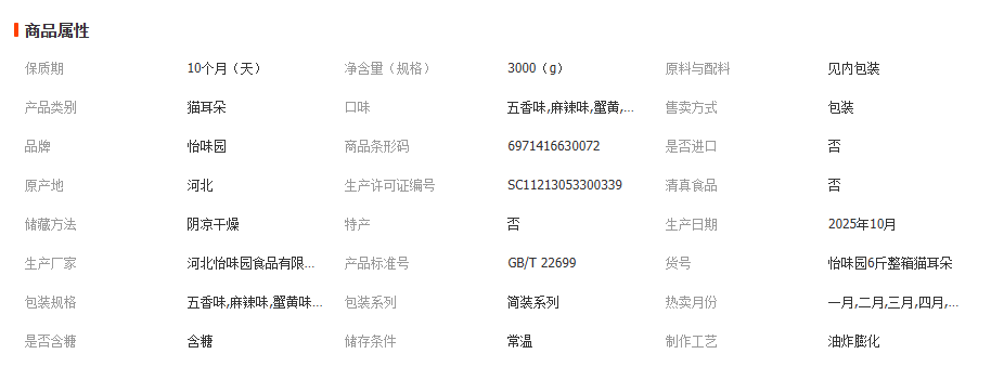 商品描述 1、产品名称:猫耳朵。本品规格:6斤/件。保质期:10个月。 2、五香味,麻辣味,蟹黄味,海苔味四种口味任您选! 3、此款产品展示箱皮仅供参考,实际发货会多种样式箱皮随机发出,具体请以收到的为准。拍单即默认您已知悉并认可!感谢理解!