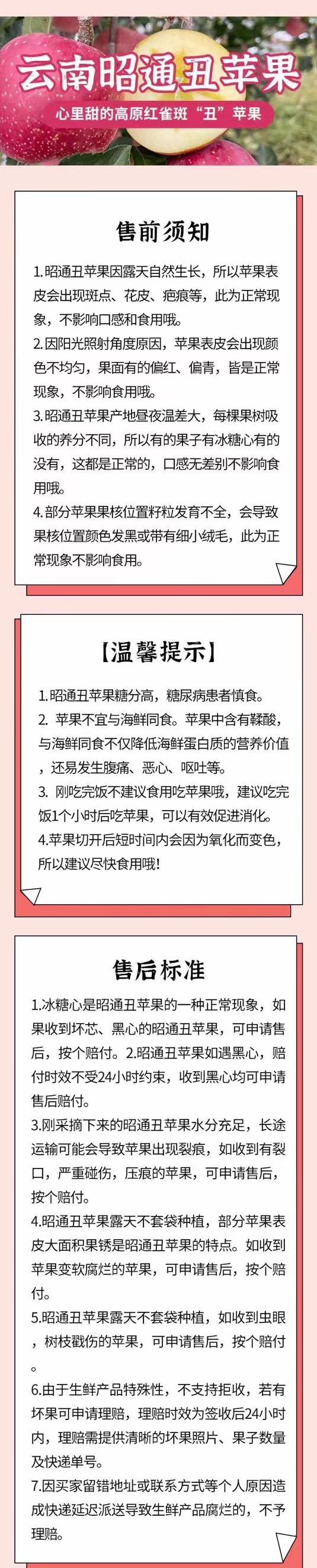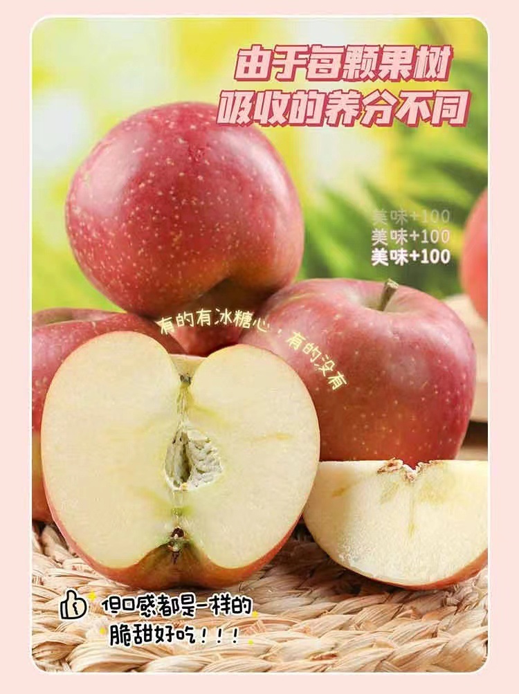 【温馨提示】:丑苹果冰糖心是一种现象,不是一种品种,所以无法保证每个都有。介意慎拍