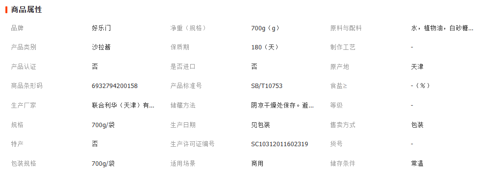 好乐门香甜沙拉酱700g 适用汉堡三明治果蔬沙拉 寿司烘焙沙拉