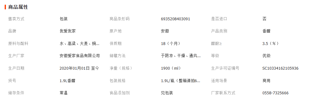 爱家香醋1900ml粮食酿造食醋家用桶装炒菜凉拌蘸料醋调料食用醋