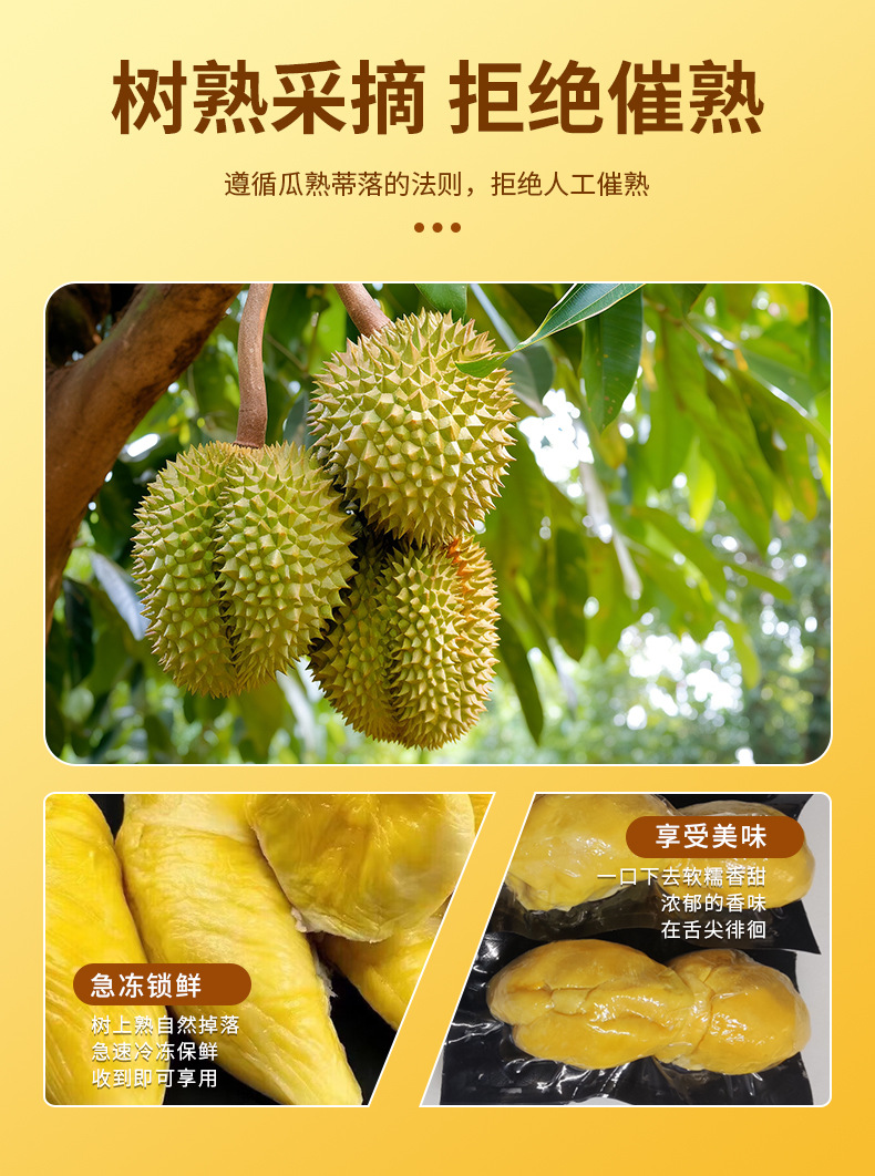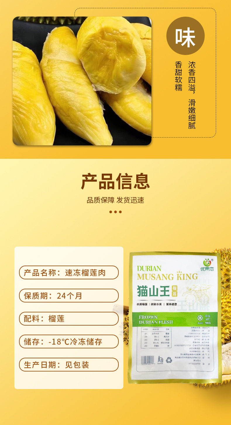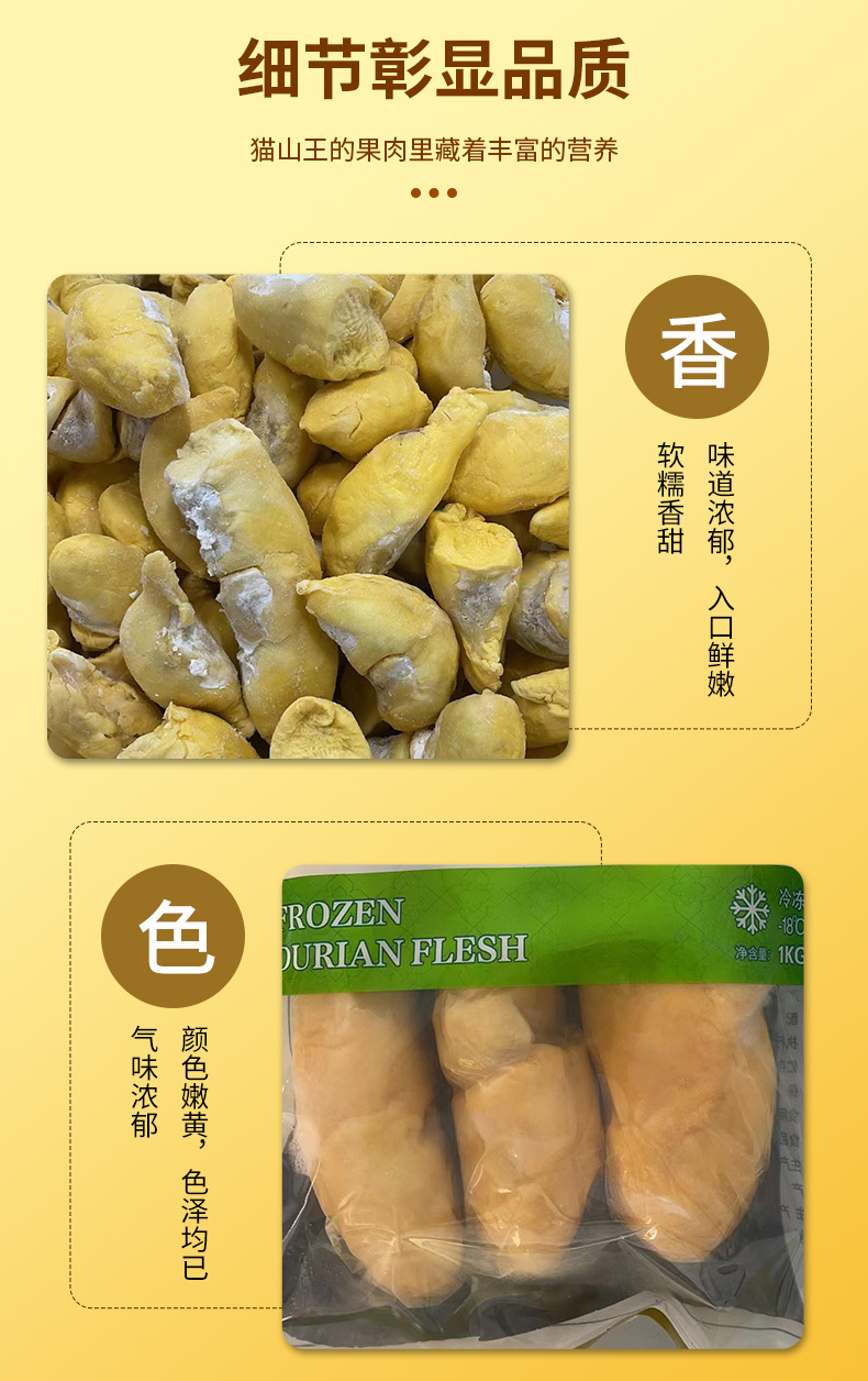 优猫1KG 速冻榴莲肉 色泽均匀 气味浓郁香浓四溢滑嫩细腻香甜软糯