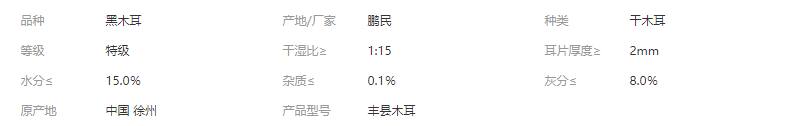 徐州丰县毛木耳肉厚,口感脆滑爽口而且营养丰富,木耳含蛋白质、脂肪、多糖和钙、隣、铁等元素以及胡萝卜素、维生素B1、维生素B2、烟酸等,还含磷脂、固醇等营养素。还有药理价值,影响血液系统,*,影响生物合成,减轻*,*作用,**,*作用,*,*、*,祛除*,清胃涤肠*。