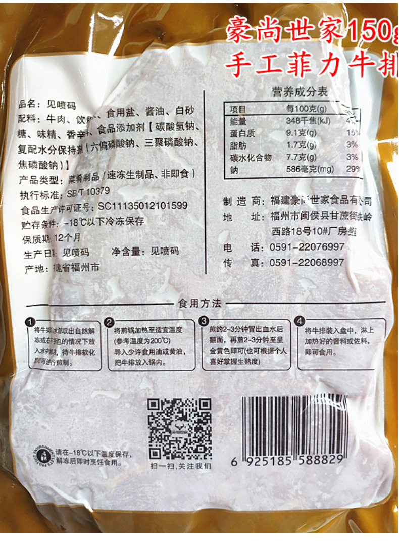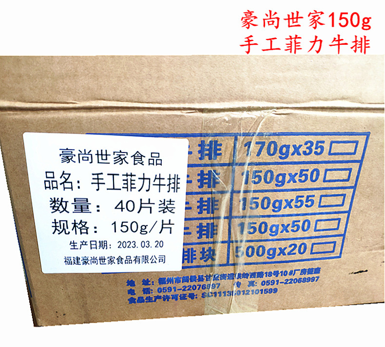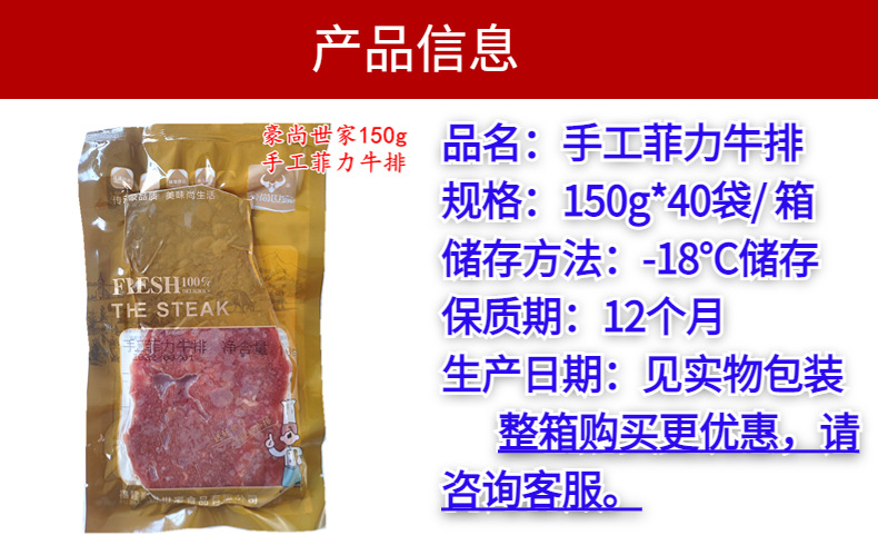 豪尚世家150g手工菲力牛排调理腌制牛排冷冻牛排家用商用包邮