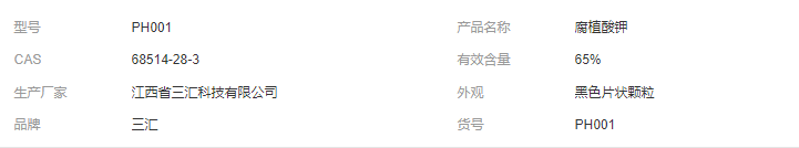 【产品名称】腐植酸钾 【储存】本品系非易燃、非易爆物品,不易吸潮,注意防雨防潮 【成份】腐植酸是动植物遗骸,主要是植物的遗骸,经过微生物的分解和转化以及地球化学的一系列过程造成和积累起来的一类有机物质。腐植酸钾是以质优的腐植酸经过提纯后用氢氧化钾反应所得 【性状】本品外观为黑色片状,易溶于水,水溶液为黑褐色,呈碱性 【用法】土壤改良亩用量:3-5KG 【有效期】24个月 【包装】本品均以双层复膜袋25kg封装,也可按需方要求更换其它理想包装
