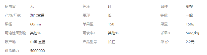 湖北秭归脐橙/纽荷尔脐橙/长虹脐橙产地批发,秭归是*的‘中国脐橙之乡’。湖北秭归脐橙品种丰富,现有大面积植纽荷尔脐橙、长虹脐橙、伦晚脐橙、蜜桔、蜜柚、椪柑、夏橙、锦橙等产品,货源充足,口感甜,颜色橘黄,果面干净,新鲜,提供清洗,分级,包装上车,一条龙服务。 |
