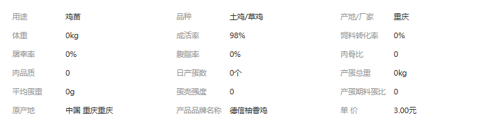 德信柚香土鸡体形呈三角形,腿细长,青脚,青嘴,羽黄以淡黄色为主。因其擅长野外散放,捕食青草,昆虫,因而体形适中,半年母鸡体重在1.5-1.7公斤左右,公鸡体形在1.8-2.5公斤。体形匀称,采食易低,半年鸡子采食量不超过9公斤,而且以原粮为主,除1月内用适量营养的全价饲料外不需其它任何饲料喂养。半年母鸡市场销价在16元/公斤以上。固始土鸡产蛋率较高,一般5个月开始产蛋,6-7个月进入高产期,平均产蛋率65%以上。德信土鸡蛋品质特别好,蛋壳颜色较淡。正常鸡蛋的重量在45克,蛋黄颜色深而大,蛋清稠且富含多种人体可需元素,氨基酸含量高出其它品种鸡蛋的许多倍,适口性好。德信土鸡蛋价位每枚在2元左右。