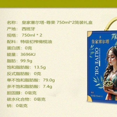 本网页所展示的有关【皇家塞尔塔西班牙特级初榨橄榄油750ml*2支简装进口原油食用油_油橄榄_北京世茂佳业商贸有限公司】的信息/图片/参数等由农芯链的会员【北京世茂佳业商贸有限公司】提供,由农芯链会员【北京世茂佳业商贸有限公司】自行对信息/图片/参数等的真实性、准确性和合法性负责,本平台(本网站)仅提供展示服务,请谨慎交易,因交易而产生的法律关系及法律纠纷由您自行协商解决,本平台(本网站)对此不承担任何责任。您在本网页可以浏览【皇家塞尔塔西班牙特级初榨橄榄油750ml*2支简装进口原油食用油_油橄榄_北京世茂佳业商贸有限公司】有关的信息/图片/价格等及提供【皇家塞尔塔西班牙特级初榨橄榄油750ml*2支简装进口原油食用油_油橄榄_北京世茂佳业商贸有限公司】的商家公司简介、联系方式等信息。
