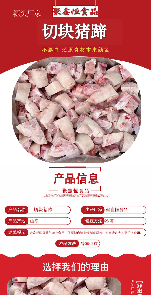 本网页所展示的有关【新鲜冷冻猪脚粒猪蹄块猪爪块 生鲜猪蹄猪肘关节与猪脚中间切块_禽畜肉蛋_新泰市聚鑫恒食品有限公司】的信息/图片/参数等由农芯链的会员【新泰市聚鑫恒食品有限公司】提供,由农芯链会员【新泰市聚鑫恒食品有限公司】自行对信息/图片/参数等的真实性、准确性和合法性负责,本平台(本网站)仅提供展示服务,请谨慎交易,因交易而产生的法律关系及法律纠纷由您自行协商解决,本平台(本网站)对此不承担任何责任。您在本网页可以浏览【新鲜冷冻猪脚粒猪蹄块猪爪块 生鲜猪蹄猪肘关节与猪脚中间切块_禽畜肉蛋_新泰市聚鑫恒食品有限公司】有关的信息/图片/价格等及提供【新鲜冷冻猪脚粒猪蹄块猪爪块 生鲜猪蹄猪肘关节与猪脚中间切块_禽畜肉蛋_新泰市聚鑫恒食品有限公司】的商家公司简介、联系方式等信息。